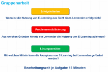 Nach dem Mittagessen schwenkte die Perspektive auf Lernende. Hier teilte Dr. Katrin Waletzke (Hochschule Niederrhein) ihre Erfahrungen aus dem Projekt Wissenschaftliche Weiterbildung und Wissenstransfer für die Region. In Gruppenarbeit wurden dann auch hier Erfolgskriterien und potentielle Hindernisse bei der Nutzung von E-Learning durch Lernende diskutiert sowie Lösungsstrategien zur Förderung der Akzeptanz durch Lernende entwickelt.