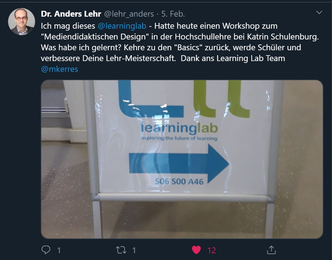 Ich mag dieses @learninglab - Hatte heute einen Workshop zum "Mediendidaktischen Design" in der Hochschullehre bei Katrin Schulenburg. Was habe ich gelernt? Kehre zu den "Basics" zurück, werde Schüler und verbessere Deine Lehr-Meisterschaft. Dank ans Learning Lab Team @mkerres pic.twitter.com/0uLpdfClD3