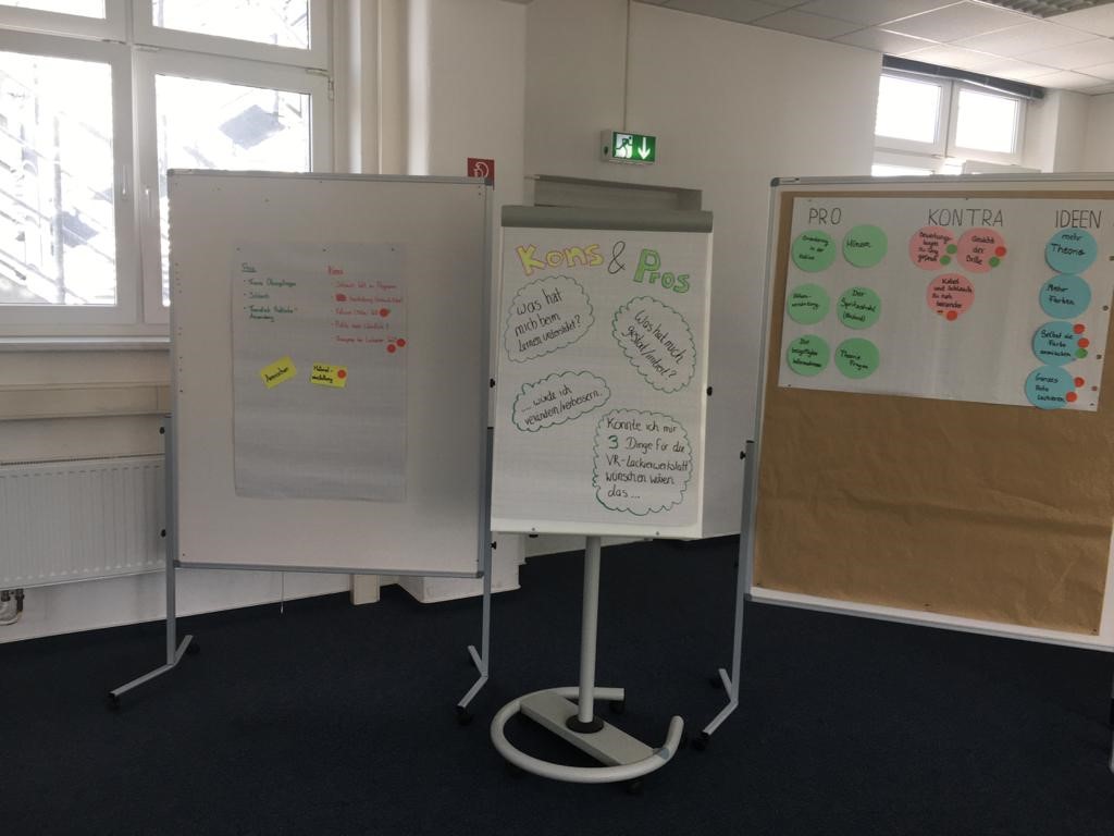 Der Schwerpunkt der Evaluation lag an den beiden Vormittagen auf dem individuellen Ertesten der entwickelten Lernaufgaben. Anschließend wurden die gesammelten Erfahrungen innerhalb von Fokusgruppen reflektiert und diskutiert. Das der VR-Lackierwekstatt zugehörige Reflektionswerkzeug, das perspektivisch Lehrenden und Ausbildungsmeistern die Möglichkeit geben soll, Aufgaben zu bewerten und Reflektionsanlässe bietet, wurde mit einem Ausbildungsmeister diskutiert und weiterentwickelt.